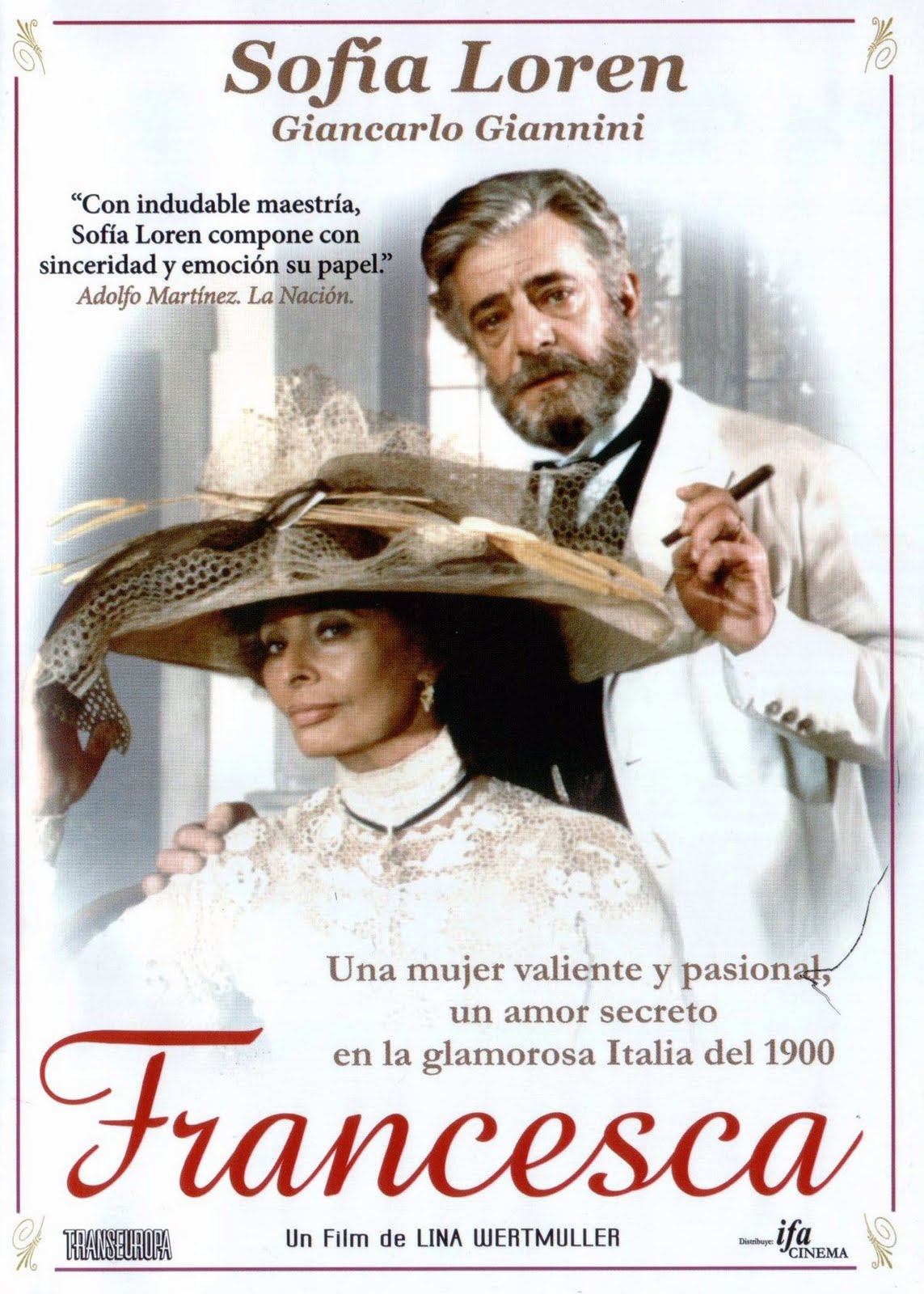 FrancescaDirector: Lina WertmüllerActores: Giancarlo Giannini, Sophia Loren Sinopsis: Una madre adopta una hija, a pesar de ya tener otros nueve hijos, y esta se convierte en su mano derecha. Con el retorno de uno de los hijos desde Londres, el lugar de la nueva hija de la familia será puesto en jaque. |