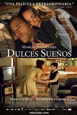Dulces sueñosDirector: Marco BellocchioActores: Bérénice Bejo, Valerio Mastandrea Sinopsis: La idílica infancia de Massimose vio truncada a los nueve años por la inexplicable muerte de su madre. Treinta años después, tras pasar por la guerra de Sarajevo como periodista, empezará a sufrir ataques de pánico. Elisa, una joven doctora, intentará ayudarlo. |